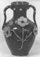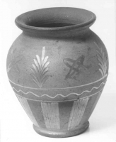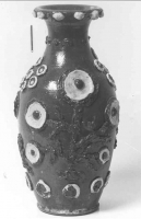 Dzban o wysmukłej szyjce i pękatym brzuścu. Dwa ucha umieszczone symetrycznie. Ornament wykonany techniką nalepiania w postaci guzów na szyjce i uchach oraz kwiatów na łodygach, brzuścu. Naczynie... | Pokaż kartę |