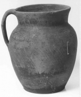 Naczynie pękate o smukłej szyjce z wąskim, profilowanym kołnierzem o wylewie nieznacznie wychylonym na zewnątrz. Ucho taśmowate, górnym końcem przymocowane poniżej kołnierza. Powierzchnia naczynia... | Pokaż kartę |