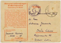 - | Dokumenty | Postkarte Kazimierza Jaworskiego z obozu koncentracyjnego w Sachsenhausen z roku 1940 adresowana do Antoniny Jaworskiej. | |