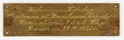 - | Inne | Blaszka mosiężna o kształcie prostokątnym, na której wyryto napis: "Kochanemu Koledze Kapitanowi art. Stanisławowi Święcickiemu Korpus oficerski 7 d. a. k. Wlkp. Poznań, dn. 24 IX 1938". | |