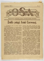 - | Dokumenty | OSA. Dwutygodnik Oficerskiej Szkoły Artylerii Wojska Polskiego, 1 III 1945 r., nr 7. Wydawana w Chełmie w drukarni "Zwierciadło", Wydawał Wydz. Polit.-Wych. OSA, stacjonowała w Chełmie. Artykuły... | |