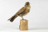 Okaz dermoplastyczny, stojący na drewnianym pieńku. Dość kolorowy, z szaropopielatą głową, ciemnobrązowym grzbietem i jasnoszarym kuprem. Na piersi wyraźnie nakrapiany. | Pokaż kartę |