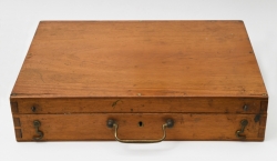Autor nieokreślony | Rzemiosło artystyczne | Drewniana, prostokątna kaseta na akcesoria malarskie. Wewnątrz wyłożona metalem tworzącym przegródki. Posiada metalowy uchwyt, zamykana na dwa symetrycznie umieszczone metalowe haczyki. | |