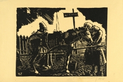 Zenon Waśniewski | Grafika | Rycina przedstawia na pierwszym planie sylwetkę konia zaprzężonego do wozu, za nim widoczne dwie postacie chłopów ubranych w kożuchy i wysokie czapki. Na drugim planie fragment płotu oraz drogowskaz.... | |