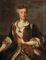 Malarz nieokreślony | Malarstwo | Portret królowej en face w ujęciu od kolan. Na głowie biała peruka i czerwony kołpaczek bramowany brązowym futerkiem, upięty klejnotami. Królową zdobią kolczyki, suknia z koronkowym haftem, kontusik... | |