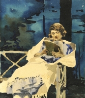 Zenon Waśniewski | Malarstwo | Akwarela przedstawia studium kobiety siedzącej na ławce i czytającej książkę, otulonej grubym, jasnym szalem. Tło stanowi fragment ogrodu utrzymanego w kolorach zieleni, szmaragdów i granatów.... | |
