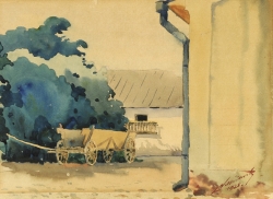 Zenon Waśniewski | Malarstwo | Na pierwszym planie fragment budynku mieszkalnego. W głębi drewniany wóz, zabudowania gospodarcze i ogród. Całość w kolorach pastelowych. Sygn. w prawym dolnym rogu: Z. Waśniewski 1928 | |