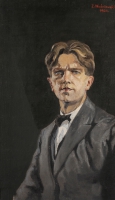 Zenon Waśniewski | Malarstwo | Portret w ujęciu en trois-quatre. Twarz pociągła, szczupła, włosy jasne, z przedziałkiem pośrodku głowy, zaczesane do góry. Artysta ubrany jest w szarą marynarkę, białą koszulę. Pod szyją... | |