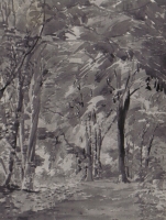 Zenon Waśniewski | Malarstwo | Akwarela przedstawia park z wysokimi liściastymi drzewami. W środku kompozycji parkowa alejka z widoczną postacią przechodnia. Całość utrzymana w kolorach zieleni, szmaragdu, beżu i bieli. Sygn.... | |