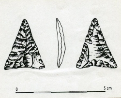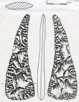 Wierzchołkowa część płoszcza o ostrzu trójkątnym. Płoszcze zachowane prawdopodobnie w około 1/2 długości. W przekroju poprzecznym - kształt soczewki. Wierzchołek tępy. Retusz powierzchniowy...