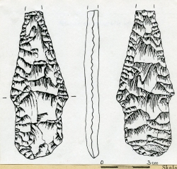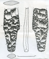 Płoszcze w przekroju poprzecznym soczewkowate. Trzonek wyodrębniony. Ostrze trójkątne. Niewielka część wierzchołka utrącona. Retusz obustronny, zaostrzający krawędzie. Na szerokim zaokrąglonym...