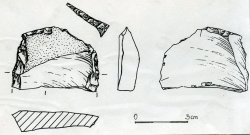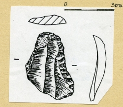 Fragment atypowego noża tylcowego. Narzędzie z dużego masywnego odłupka, częściowo korowego. Tylec uformowany łukowato, retuszem stromym na stronę wierzchnią.