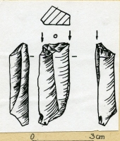 Rylczak z rylca węgłowego. Narzędzie zrobione na wiórze odbitym z rdzenia jednopiętowego. W przekroju poprzecznym - pięcioboczne. Wzdłuż krawędzi bocznych odbicia rylcowcze. Jedno wzdłuż...