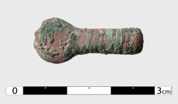 Fragment bransolety ze stopu miedzi. Kabłąk w przekroju poprzeczny płasko-wypukły, z drobnymi nacięciami na zewnątrz - rodzaj zdobienia. Koniec rozklepany, płaski, zaokrąglony.
