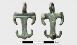 Okucie sakwy w kształcie "lilii" z trójlistnym wierzchołkiem i poszerzoną, w kształcie prostopadłej poprzeczki podstawą. Na osi zabytku, w centrum podstawy umieszczono oczko prostopadłe do płaszczyzny...
