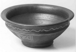 Miska z krawędzią wylewu wychyloną na zewnątrz, z wysokim kołnierzem z niewielkim wgłębieniem, z dobrze wyodrębnionym dnem. Ornament ryty geometryczny w postaci linii pokrywającej spiralnie całe... | Pokaż kartę |