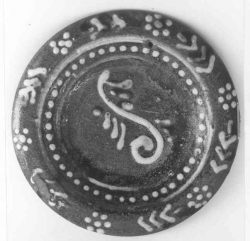 Talerzyk o lekko zagłębionym dnie i szerokim brzegu, z otworem do zawieszania. Powierzchnia naczynia pokryta glazurą z ornamentem malowanym geometrycznym i stylizowanym roślinnym, barwy białej i zielonej,... | Pokaż kartę |