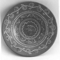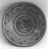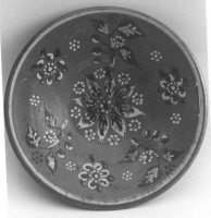 Talerz gliniany płaski, płytki. Glazura bezbarwna, pokrywająca naczynie z obu stron. Ornament malowany wewnątrz naczynia barwy białej, zielonej i niebieskiej, roślinno-geometryczny: kwiat na gałązce... | Pokaż kartę |