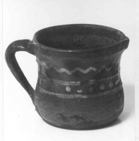 Dzbanuszek o nisko opuszczonym brzuścu, nad nim lekkie przewężenie, przy szyjce naczynie rozszerza się. Krawędź wylewu poszerzona z maleńkim dziobkiem. Ucho ze spłaszczonego kawałka gliny dolnym... | Pokaż kartę |