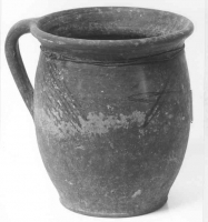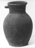 Naczynie pękate o smukłej szyjce z wąskim, profilowanym kołnierzem o wylewie nieznacznie wychylonym na zewnątrz. Ucho taśmowate, górnym końcem przymocowane poniżej kołnierza. Powierzchnia naczynia... | Pokaż kartę |