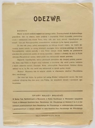 - | Dokumenty | Odezwa, druk ulotny Głównego Komitetu Daru Narodowego na rzecz Józefa Piłsudskiego. Dwustronna | |