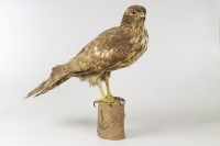 Okaz dermoplstyczny, stojący na drewnianym pniu. Samica, w upierzeniu której panują kolory brązowe, rdzawe, szare. Ogólnie ubarwienie można określić jako maskujące. | Pokaż kartę |