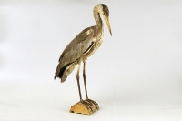 Okaz dermoplastyczny, stojący na drewnianej podstawce. Upierzenie w różnych odcieniach szarości. Szyja zgięta w kształcie litery "S". | Pokaż kartę |