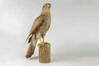 Okaz dermoplastyczny, stojący na drewnianym pniu. Osobnik dorosły, na jasnym tle piersi i brzucha prążkowanie poprzeczne. Nogi krótkie z długimi hakowatymi szponami. | Pokaż kartę |