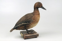 Okaz dermoplastyczny, stojący na drewnianej podstawce. Ubarwienie kasztanowo-brązowe o białym spodzie. Dziób niebieskoszary. Charakterystyczna biała plama z piór pod ogonem. | Pokaż kartę |