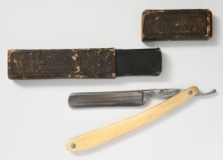 Gebr. Emde (Emde Bros.) | Rzemiosło artystyczne | Przedwojenna brzytwa w kościanej oprawie niemieckiej wytwórni z siedzibą w miejscowości Solingen. Sygnowana Brosem Gebr. Emde Weyer-Solingen, z oryginalnym etui. | |