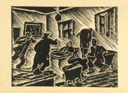 Zenon Waśniewski | Grafika | Rycina przedstawia wnętrze pokoju z grupą postaci. Po lewej ukazanych jest trzech mężczyzn siedzących w fotelach, czwarty zaś stoi przy ścianie odwrócony plecami do pozostałych. Po prawej mężczyzna... | |