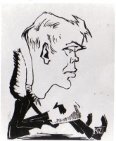 Zenon Waśniewski | Grafika | Rycina przedstawia autokarykaturę artysty. Przerysowana duża głowa ukazana z profilu. Sylwetka artysty w pozycji siedzącej z lekko ugiętymi nogami. Sygnowana po lewej stronie na bucie monogramem "WZ". | |