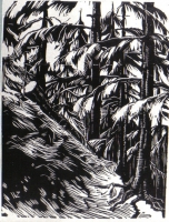 Zenon Waśniewski | Grafika | Rycina przedstawia fragment porośniętego wysokimi sosnami górskiego zbocza, ze zwalonym pniem drzewa. Sygnowana w lewym dolnym rogu monogramem "WZ". | |