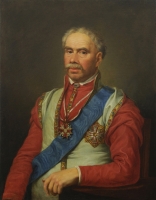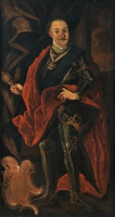 Artysta nieokreślony | Malarstwo | Portret en pied mężczyzny w zbroi zdobionej złotym ornamentem. Na niej przerzucony czerwony płaszcz. Głowa wysoko podgolona. Przez lewe ramię przewieszona niebieska wstęga Orderu Orła Białego,... | |