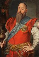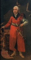 Artysta nieokreślony | Malarstwo | Reprezentacyjny portret en pied. Mężczyzna o siwych włosach i wąsach, ubrany w długi, czerwony kontusz z czarnym wyłogiem, spięty na piersi złotym guzem. W tali przepasany bogato zdobionym pasem.... | |