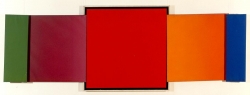 Sosnowski Kajetan (1913-1987) | Malarstwo | Kompozycja złożona z pięciu plansz. Środkowa, największa - stanowi kwadrat w kolorze czerwonym z czarnym i białym obramieniem, z jego lewej strony znajduje się mniejszy kwadrat w kolorze fioletowym,... | |