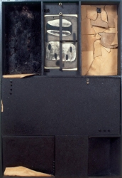 Matuszewski Andrzej (1924-2008) | Malarstwo | Głęboka na 10 cm kaseta - podzielona na kilka części. W górnej partii trzy wnęki, lewa wyłożona czarnym futrem, w środkowej umieszczona grafika z napisem "48 z cyklu odblaskalia 180367 M", prawa... | |