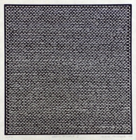 Starczewski Antoni (1924-2000) | Grafika | Na czarnym tle układ poziomych rzędów owalnych, białych form. Wokół tego wzdłuż krawędzi, równolegle do nich rząd takich samych form. U dołu, ołówkiem nazwa i sygnatura: "MF 4 épreuvr d'artiste... | |