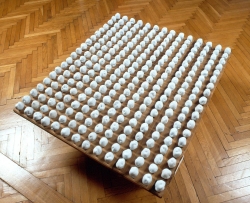 Starczewski Antoni (1924-2000) | Rzeźba | Na drewnianej płycie 14 rzędów porcelanowych odlewów ziemniaków w kolorze białym. W co drugim rzędzie porcelanowe ziemniaki - glazurowane. Rzeźba niesygnowana. | |